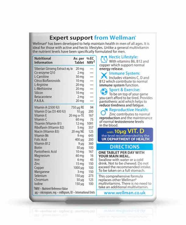 - قرص wellman حاوی عصاره جینسینگ سیبری، جهت افزایش انرژی و کاهش خستگی می باشد.